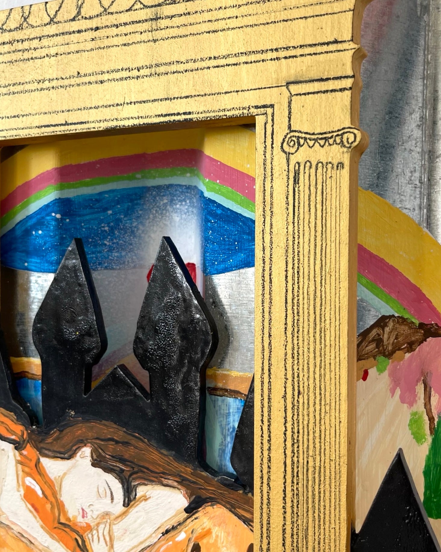 Emulsion, coloured pencil, spray paint, MDF board, acrylic sheet & velcro on corrugated steel