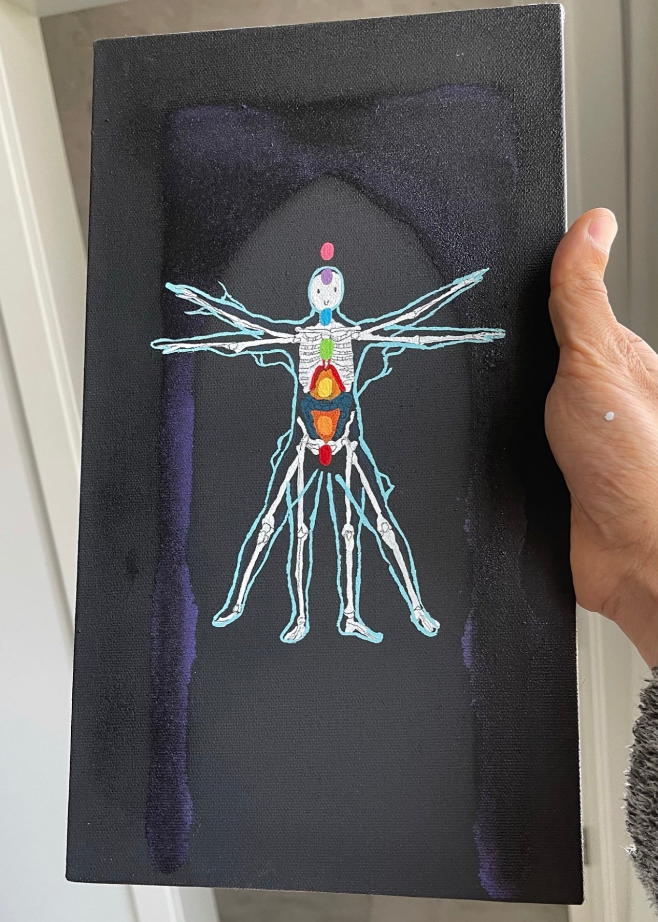 Emulsion, spray paint & coloured pencil on canvas board